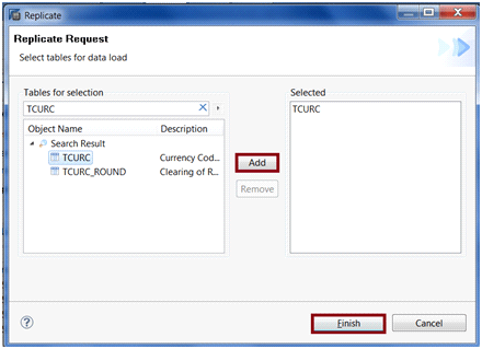 6. Click the Replicate button in Figure 27, and choose the table you want to replicate (Figure 28). The Load and Replicate buttons shown in Figure 27 control the way data enters the SAP HANA system. The load option performs an initial load only, whereas the replicate option performs an initial load and then replicates any data changes.