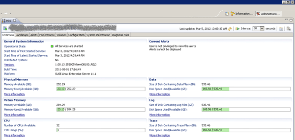Once you add the system to SAP HANA Studio, you see two folders under the system entry: Catalog and Content. The Administration Console shows details about the SAP HANA server (e.g., memory, CPU, performance, alerts, logs), as shown in Figure 5.