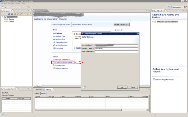 In SAP HANA Studio, you need to configure the import server (Figure 9). First enter the address of the Data Services server and the repository name. Click the OK button.