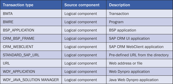 To proceed further, let’s add transactions to the created structure. Table 1 shows a list of transaction types that you can add, such as SAP transactions, Business Server Pages (BSP) applications, or Web GUI transactions.