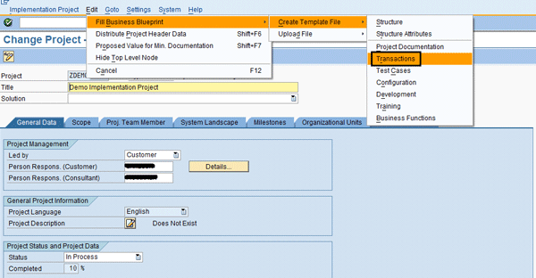 Step 11. Repeat steps 1 and 2 and go to change mode for your project. Follow menu path Edit > Fill Business Blueprint > Create Template File > Transactions (Figure 15). Save the Excel-formatted file to your local desktop and then distribute it further for inputs.