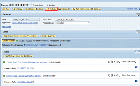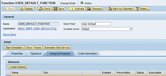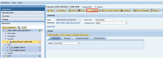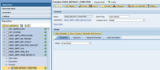The user default rule is a standard application in SAP Access Control 10.0. The application is defined and maintained within the BRFplus workbench. You need to check for the correct function ID in the BRFplus workbench. To identify the correct function ID, access transaction code BRFplus and navigate to the appropriate function of the application as shown in