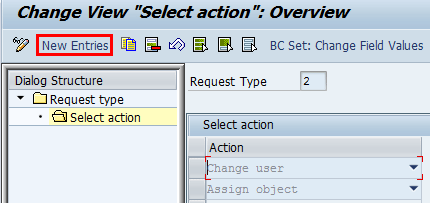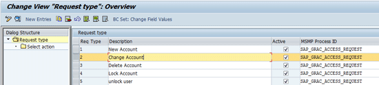 The attribute of the request types influences the behavior of the user default access control application. Activating the Business Configuration Set (BC Set) GRAC_ACCESS_REQUEST_REQ_TYPE via transaction code SCPR20 populates the system with standard request types and actions. The following actions are predelivered in the system: