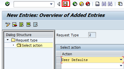 To configure the user default to work for different request types, you need to associate the action (user defaults) to the request type in addition to any other desired actions. This action allows the request to consider the user defaults associated with the request. To perform the configuration for assignment of user default action to a request type, follow menu path SPRO > SAP Reference IMG > SAP Customizing Implementation Guide > Governance, Risk and Compliance > Access Control > User Provisioning > Define Request Type. In the screen that appears (