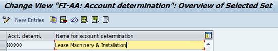 To maintain account determination rules in the IMG, follow menu path Financial Accounting > Asset Accounting > Organizational Structures > Asset Classes > Specify account determination. Figure 1 shows an example of the account determination. This is merely a code and a description. The actual accounts to be used are assigned later.