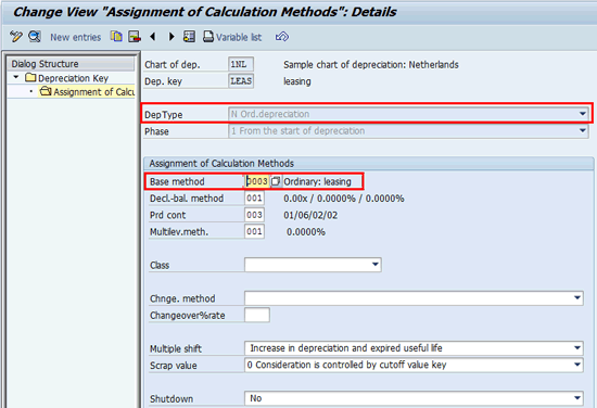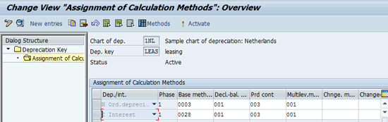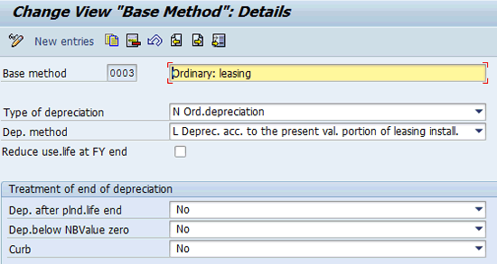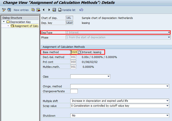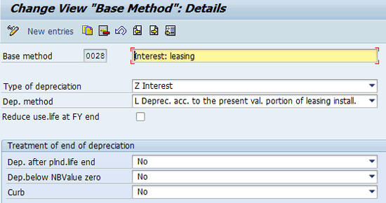 To maintain the base methods in the IMG, follow menu path Financial Accounting > Asset Accounting > Depreciation > Depreciation Key > Calculation methods > Define Base Methods. SAP has defined standard base methods. Two of these have been set up especially for leasing. For the depreciation calculation this is base method 0003, and for the interest calculation it is base method 0028.