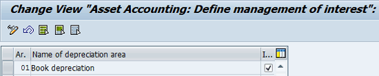 To maintain the indicator in the IMG, follow menu path Financial Accounting > Asset Accounting > Special Valuation> Interest > Determine Depreciation Areas or directly via transaction code OABZ. Figure 12 shows the setting for depreciation area 01.