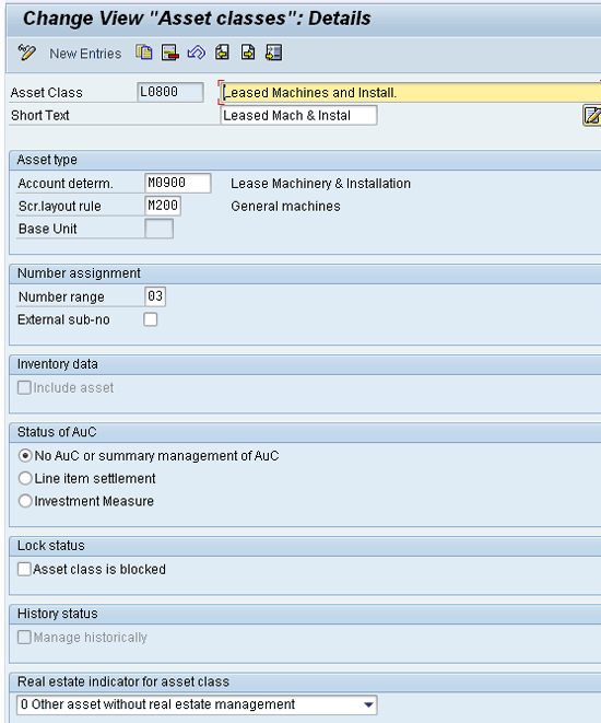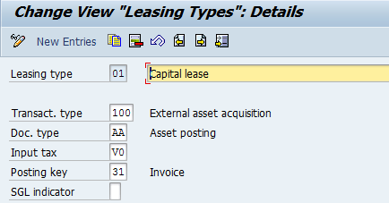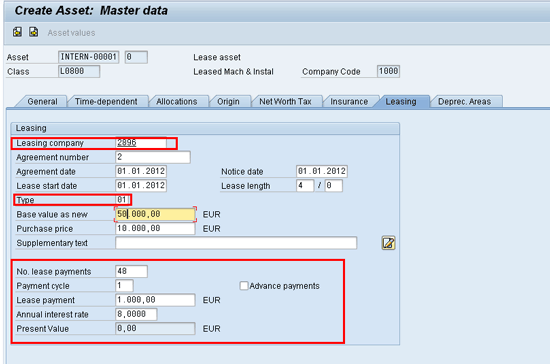 - Type: The leasing type is used to characterize the leasing contract, but it also holds default values for the acquisition posting. The SAP system considers the asset to be a leased asset only when a value has been entered in the Type field.
