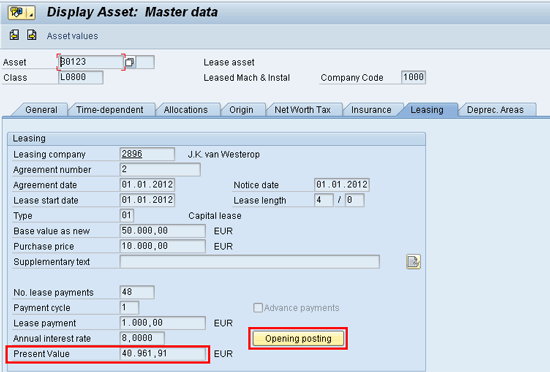 Because capital leases are registered as assets, they should be recorded in the fixed-asset module (FA) of the SAP system. However, leased assets are different from other assets: They are reported on the debit side of the balance sheet and also as liabilities (Accounts Payable) on the credit side of the balance sheet. The assets are valuated as the sum of all payments minus the included interest. For leased assets a payment has to be made periodically to the lessor (vendor). Part of the amount paid is interest, and this must be posted separately.