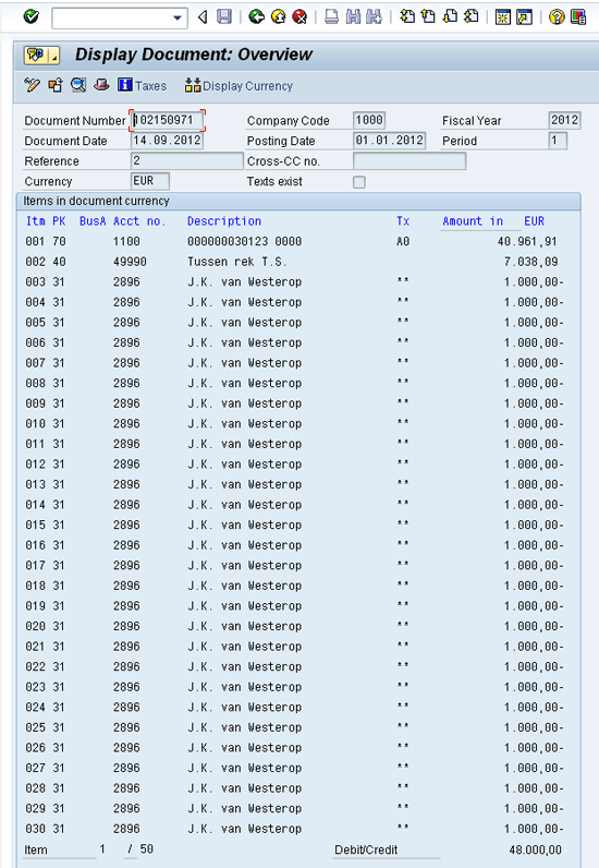 The Opening posting button only appears in transaction code AS03 as long as no posting has been created. As soon as you click it, a financial posting is created. The financial document uses the parameters belonging to the lease type, leasing company number, lease amount, payment amount, payment cycle, and number of lease payments. The financial document is shown in Figure 16.
