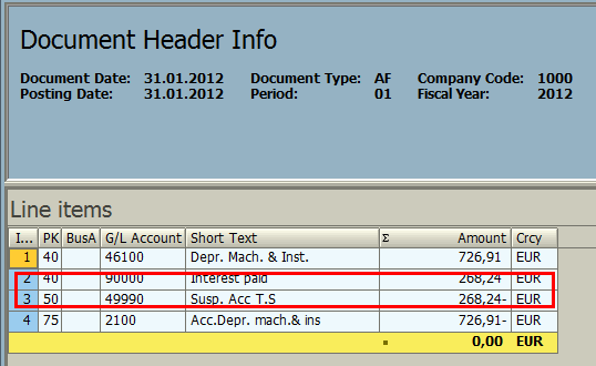 No specific action is required for the depreciation run (transaction code AFAB). However, the posting of the depreciation also contains interest costs. Figure 17 shows an example of a posting created during the depreciation run. Besides the standard depreciation posting, interest costs are also posted.
