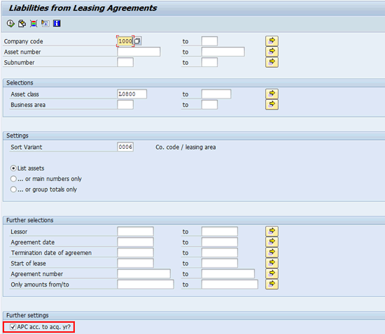 Transaction code S_ALR_87010139 can be used to report leased asset master data. Transaction code S_ALR_87010141 is a report specially built to report liabilities from leasing agreements. Figure 18 shows part of the selection screen of this report. If the APC acc. to acq. yr? check box is selected, then the statistical market value is reported. The same report can also be started using transaction code S_ALR_87011992 or AR17.