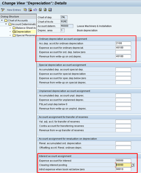 For depreciation you must assign not only the depreciation accounts (highlighted at the top of the screen in Figure 4, standard way of working) but also the interest accounts (bottom of the screen). You can enter three interest accounts: