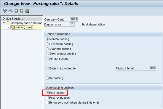 To maintain the posting rules for the depreciation areas in the IMG, follow menu path Financial Accounting > Asset Accounting > Integration with the general ledger > Specify Intervals and Posting Rules or use transaction code AOYR. Figure 5 shows the settings for the depreciation area. In the Other posting settings section, select the Post interest check box to post the interest in the SAP G/L.