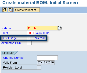 One of the important controlling parameters in the process of standard cost calculation is the costing variant. In the definition of a costing variant, a quantity structure control key is included. The quantity structure control key determines the BOM used for cost calculation based on the BOM usage type.