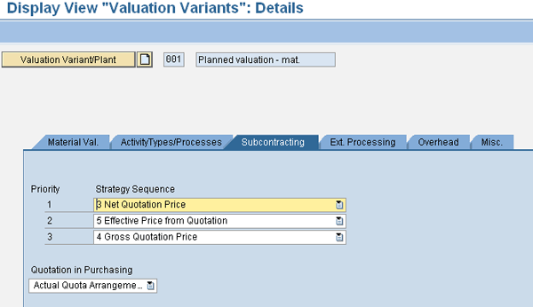 Use transaction OKK4 to modify the valuation variant that is used for standard costing. Under the Subcontracting tab, specify a valuation strategy for the system to find the price of vendor charges (Figure 4). You can specify the vendor charges by using either the purchase info records (PIR), a quotation, or a purchase order.