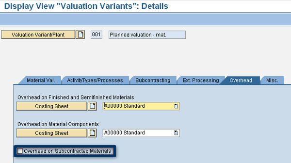 The overhead costing sheet is specified under the Overhead tab of the valuation variant. Check the Overhead on Subcontracted Materials check box to include the costing sheet in the standard costing process (Figure 6).