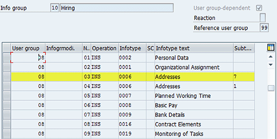 At the point at which infotypes are assigned to each InfoGroup, a new entry is made for the addresses infotype with the work address subtype. For example, Figure 4 shows all the infotypes that are created in the hiring action. In my scenario, a new entry for infotype 0006 (Addresses) with the work address subtype (7) is inserted. Just make sure that the subtype value corresponds to the value you verified or created in Step 1.
