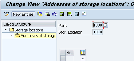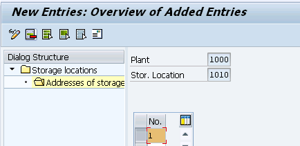 In the No. column, enter the number 1 for your storage location (Figure 10), and press Enter. This opens the screen shown in Figure 11, where you can input the personnel subarea address. (If this subscreen does not appear after you press Enter, click the address icon