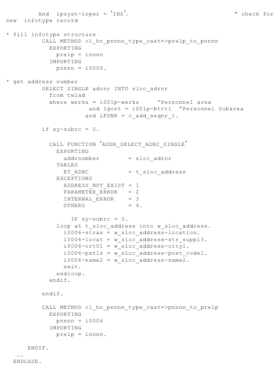 In transaction code SE38 enter the include name ZXPADU01 and add the code shown in Figure 12. If this user exit is already in use, you'll have to merge the code below into your existing code.