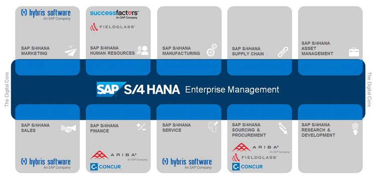 SAP S/4 HANA is SAP’s next generation business suite built on its advanced in-memory platform, SAP HANA. It offers a personalized user experience with SAP Fiori. At the center of SAP S/4HANA, SAP is simplifying the SAP ERP solution and re-integrating and simplifying portions of the SAP Business Suite products, such as SAP Supplier Relationship Management (SRM), Customer Relationship Management (CRM), and Supply Chain Management (SCM) into the S/4HANA core. S/4HANA core is the technical description for the new SAP ERP Central Component (ECC). The SAP S/4HANA Enterprise Management core is available on premise and in the cloud.