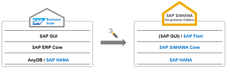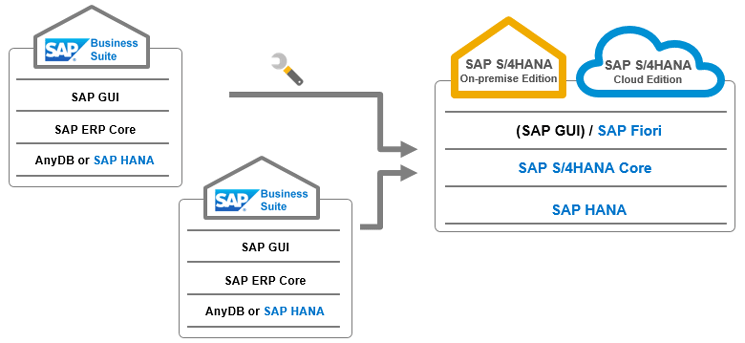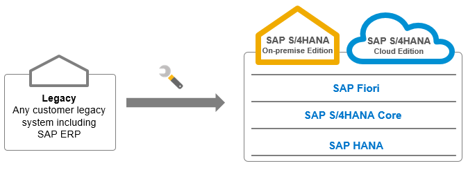 - Convert the existing SAP Business Suite system to SAP S/4HANA, on-premise edition. The data transition from the old structures to the new structures uses tools that are built into the software.