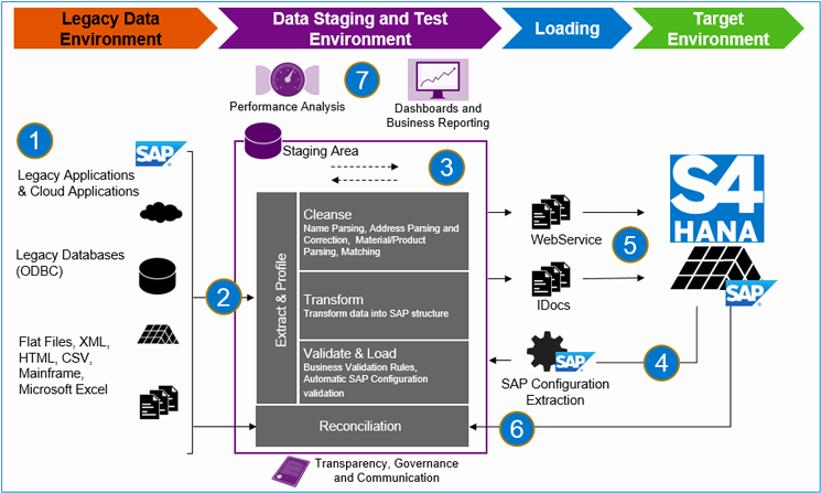 - Data load: The data load occurs via SAP standard interfaces that are leveraged to increase data quality and consistency.