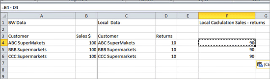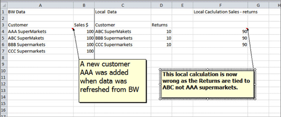 However, the problem with this default method of presenting BW data becomes evident in Figure 2, when the data from SAP BW is refreshed. All the calculations in Figure 1 become incorrect when SAP BW provides refreshed data that includes a new record, AAA Supermarkets. Since this customer is not in the local data columns (in Figure 1), the inserted row makes the F4 cell calculation wrong in Figure 2. Instead of AAA SuperMarkets sales – Returns it stays ABC SuperMarkets sales – Returns.