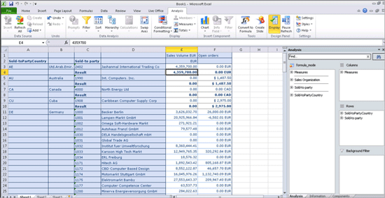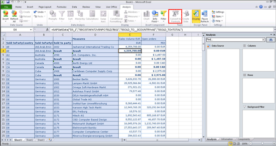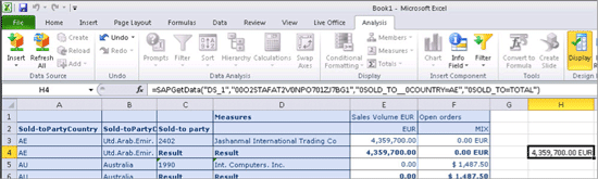 Converting to formula mode is easy. In the Analysis tab, in Tools, click the Convert to Formula icon (Figure 4). This switches the spreadsheet to formula mode. At first glance, the numbers and attributes look the same, but upon closer inspection, the formula for each cell ties the cell independently to the SAP BW Query output, not as a collective grid of numbers and characters as it was before. In Figure 3, the highlighted formula might not look right, but the long cryptic string is the technical ID for the Sales Volume EUR key figure. Knowing this, the formula is easy to interpret. Simply stated, the formula returns for DS = 1 (my formula mode query), the total sales for all customers in the United Arab Emirates (AE).