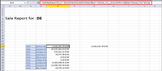 In this same Worksheet (Figure 7) with the same embedded formula mode query (Data source1), I entered in a bunch of cells manually. Make special note of the Sale Report for: DE cell in D4 and the technical names of the customers in C14 – C22. Now let’s focus on the formula.