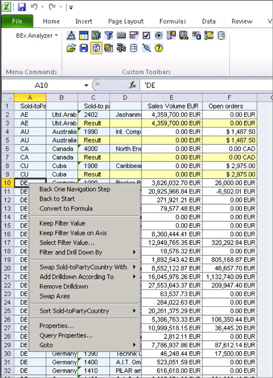 The example discussed above focuses on formula mode within BusinessObjects Analysis. However, the older BEx analyzer tool actually has slightly more functionality related to formula mode. The functionality of converting to formula mode in the BEx Analyzer is nearly the same, except that access is via a right-click context menu on the table of data versus the menu bar icon option in BusinessObjects Analysis. Select a cell on the query-returned matrix of cells that you want to convert to formula mode (in this case, DE), and right-click to open the context menu. Then select the Convert to Formula option (Figure 8). Formula mode is activated just as it was with the button version in BusinessObjects Analysis.