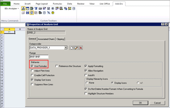 When designing a Workbook using BEx Analyzer (out of scope for this article), there is an analysis grid design element that you can use to customize the display of tables of data, as well as customizing buttons and check boxes. For the analysis grid there is a special option you can set in the design process called Use Formulas (Figure 10).