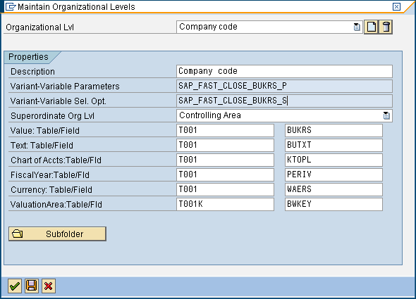 The system provides default selection variables for SAP Financial Closing cockpit. You can view the selection variables by displaying the organizational level. Figure 1 shows the variables defined for organizational level Company code. Use transaction CLOCOC and on the menu bar follow Template/Task List > Organizational Hierarchies > Organizational Level.