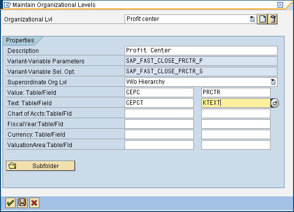 Apart from the selection variables defined above, the system generates additional new variables when you create a new organizational hierarchy. For example, if you create a hierarchy called Profit Center, the system creates two new variables: SAP_FAST_CLOSE_PRCTR_P and SAP_FAST_CLOSE_PRCTR_S.