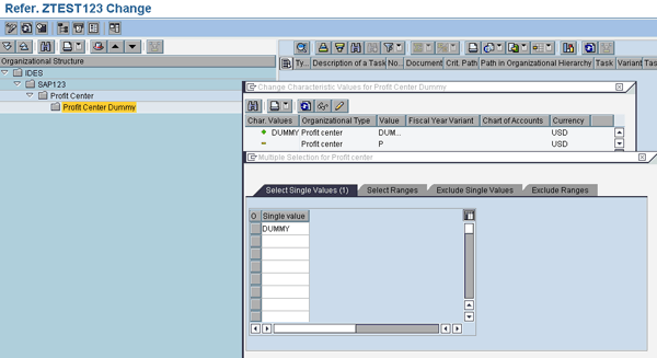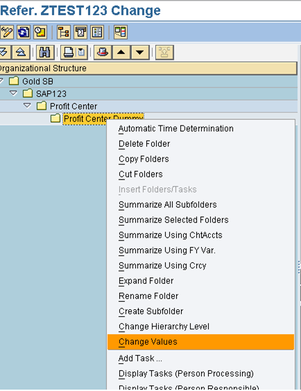 I can now add values to the Profit Center Dummy folder by right-clicking the Profit Center Dummy folder and selecting Change Values (Figure 5). For example, you can assign a profit center to the folder (Figure 6).