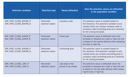 When you create a closing template, the system generates various variables with parameters. You can use these variables in a variant to default parameter values (on a report or program) that are assigned in SAP Financial Closing cockpit. SAP Financial Closing cockpit includes the predefined selection variables shown in Table 1.