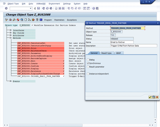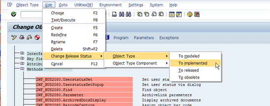 The next step is to implement the method you just created. Scroll down the screen until you find ZWF_BUS_2088.TRIGGER_EMAIL_FROM_PARTNER. Follow menu path Edit > Change Release Status > Object Type > To implemented (the system warns you through error messages if you forget this step) as shown in Figure 11.
