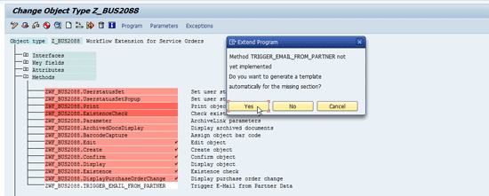 Implementing the method allows you to put code into the method. To do this, place the cursor on the method ZWF_BUS2088.TRIGGER_EMAIL_FROM_PARTNER and click the Program button shown in Figure 12. The first time you click the Program button for this method you need to generate the template. When the pop-up screen appears, click the Yes button.