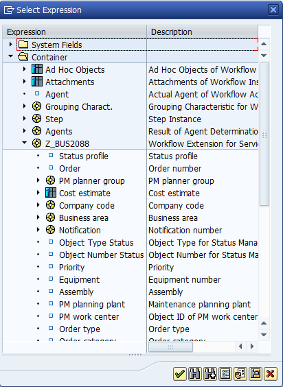 shown in Figure 20 and selecting the appropriate objects. This puts the text into the workflow task that is created for the event. This text allows you to see at a glance which orders have been executed within the workflow list. In Figure 20, the Number (WI_OBJECT_ID.NUMBER) and the Order type (Z_BUS2088) are shown.