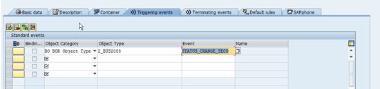 You need to bind the event to the object. This transfers the values from the workflow object to the BOR Object Type. Enter in the Object Category of BO BOR Object Type, an object type equal to the new object created, Z_BUS2088. The Event is the new event created, STATUS_CHANGE_TECO. Press Enter to finalize your choices. After you press Enter, the event creator icon