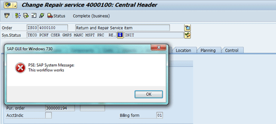 If everything is working, you should see a pop-up window resulting from the sample code inserted. Finally, run a real test. Go to a service order and technically complete it. Execute transaction code IW32. In the screen that appears, enter the service order number and press Enter. Click the checkered flag icon to technically complete the service order (Figure 26).