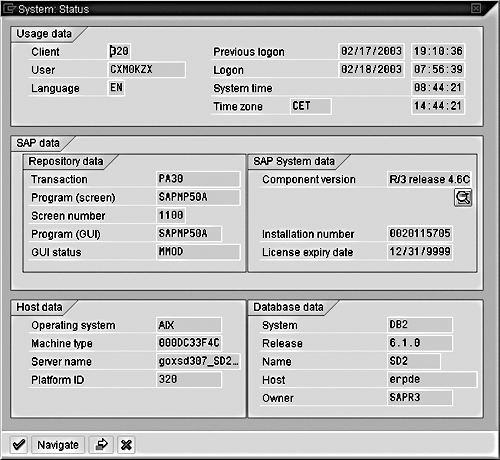 The first step is to determine the current version and support pack level of your system. From any R/3 screen, choose the menu path System>Status. This displays the window shown in Figure 1. The section titled SAP System data displays the Component version of your system. Click on the magnifying glass to open the system component information window. Click on the Support Packages tab and scroll down to the end of the HR Support Packages. HRSPs have names that start with SAPKE, followed by the SAP version number and the HRSP number. The sample customer illustrated in Figure 2 is on version 4.6C and HRSP level 66. This means that all support packs up to and including number 66 have been installed. It is a good idea to perform this check on each instance in your system landscape to verify that they are all on the same HRSP level.