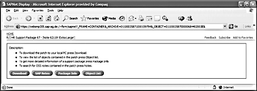 Now that you know which HRSPs are available, you need to build a complete understanding of the software changes they represent. SAP makes this analysis relatively easy by assigning each change an SAP note number and then assigning each note to a support pack. Start the process by clicking on the name of the support pack. Figure 4 shows the additional information available for Support Package 67. A Basis team member uses the Download link to copy the support pack’s transport file to a local server. An ABAP team member uses the Object List link to anticipate changes that could affect modified SAP code. The Package Info link gives some general information about the support pack. The SAP Notes link provides a list of all notes that are included in the support pack.