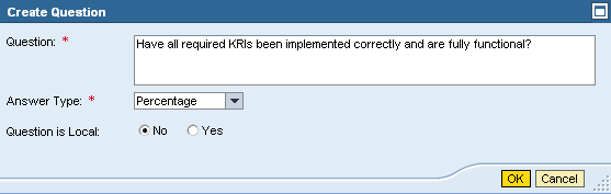 SAP BusinessObjects Risk Management 3.0 comes with a question and survey library. This means that you can schedule surveys multiple times and for different parts of your enterprise, and reuse questions in multiple surveys. For that reason, before creating new surveys or questions in GRC Risk Management > Risk Assessment > Surveys you should review the library first. Figures 11 and 12 show the screens to create a new survey and a new question, respectively. You need to specify a title for the new survey and the survey category as Activity Survey, Risk Survey, or Risk Indicator Survey. Then add existing questions from the questions library, or create new questions by clicking the Actions button and selecting Create Question. Select for each question an answer type, which can be Rating (1 to 5), Yes/No/NA, Text, Percentage, or Amount. You can also assign to questions a category such as Activity Survey, Risk Survey, or Risk Indicator Survey and only use them in a survey of the respective category. Questions can be local with respect to the survey or available for other surveys — check the respective radio button in the question. You need to activate the survey before you can schedule it.