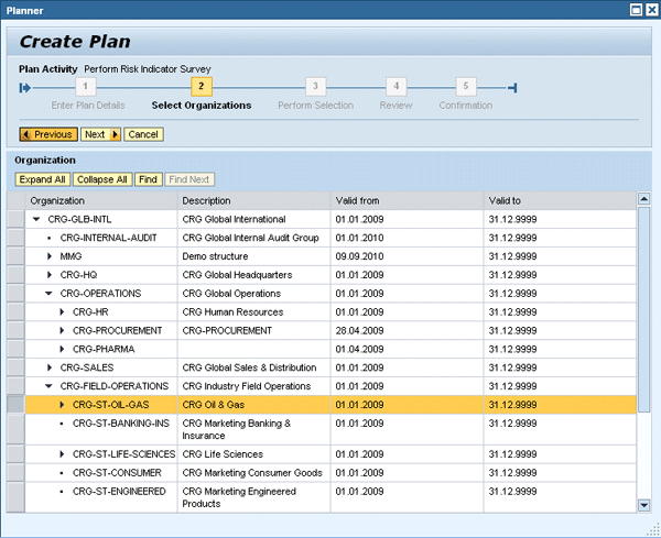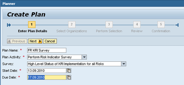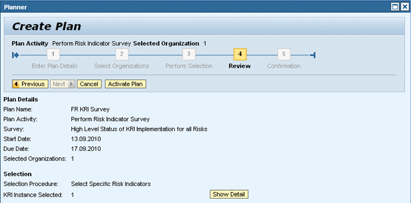 Surveys are scheduled with the planner tool accessible via menu path GRC Risk Management > Risk Monitoring > Planner. In the first step of the guided procedure enter the plan details consisting of plan name, plan activity specifying the survey category, survey from the survey library, and the start and due date (Figure 13). In the second step, select the organizations you want to cover with the survey (Figure 14). In the third step, select activities, risks, or KRI instances from the previously selected organizations for which you want to conduct the survey (Figure 15). Finally, review the plan (Figure 16) and receive a confirmation upon activation of the plan.