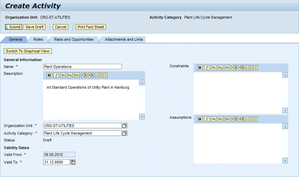 To create a new activity, log on to SAP NetWeaver Portal, navigate to GRC Risk Management > Risk Assessment > Activities, and click the Activity Management link. In the General tab, provide a name and select an organization unit and activity category (Figure 2). The selection of the activity category determines the activity type. Each activity type has a separate hierarchy of activity categories. If necessary, delimit the validity date of the new activity as needed (e.g., for projects) and provide a description and add constraints and assumptions.