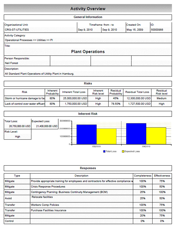 A useful feature is the Print Fact Sheet button, which generates a PDF with a summary of all available information on the selected activity including all general information, activity owner, and details on relevant risk assessments and risk responses (Figure 3). Similar print fact sheets are also available for risks.