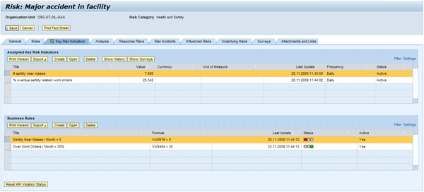 In the lower part of the Key Risk Indicator tab, you create business rules that are applied to the KRI data queried from your remote business systems. Figure 8 shows an example of a business rule checking the result from a KRI querying the number of safety near misses. If that number is greater than zero, by configuration the business rule flags the risk, sends a notification to the risk owner, and triggers a risk assessment workflow. A flagged risk shows a yellow lightning symbol on the Key Risk Indicator tab (Figure 5), which you can remove by clicking the Reset KRI Violation Status button on the bottom of the screen.