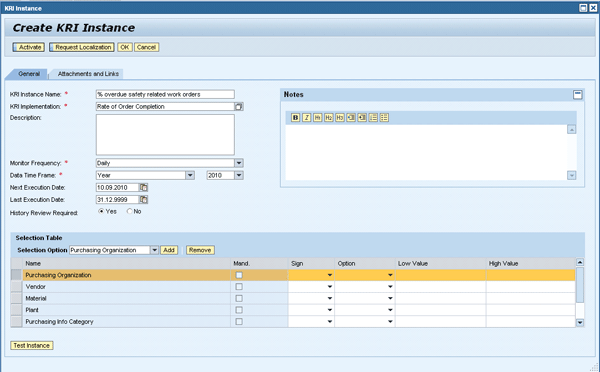 A KRI instance may require further data filtering for a more focused monitoring with respect to the organizational context of the selected risk. This is referred to as KRI localization. You can either enter further filters in the selection table or click the Request Localization button (Figure 6). The latter triggers a workflow task sent to the inbox of the holder of the application role that has been customized to receive the workflow tasks for the business event KRI Liaison. The recipient then performs the localization of the KRI in the selection table.