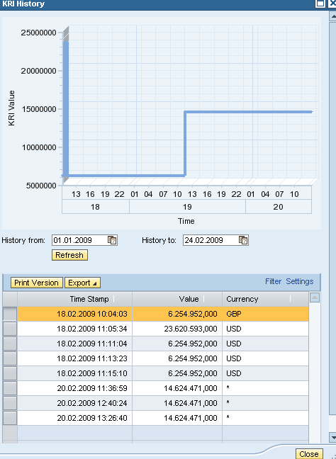 - Historical Review Required: Select Yes if you want the previous KRI values kept in the database. In Figure 7, you can see the graphical representation of the data, which you can access by clicking the Show History button in Figure 5.